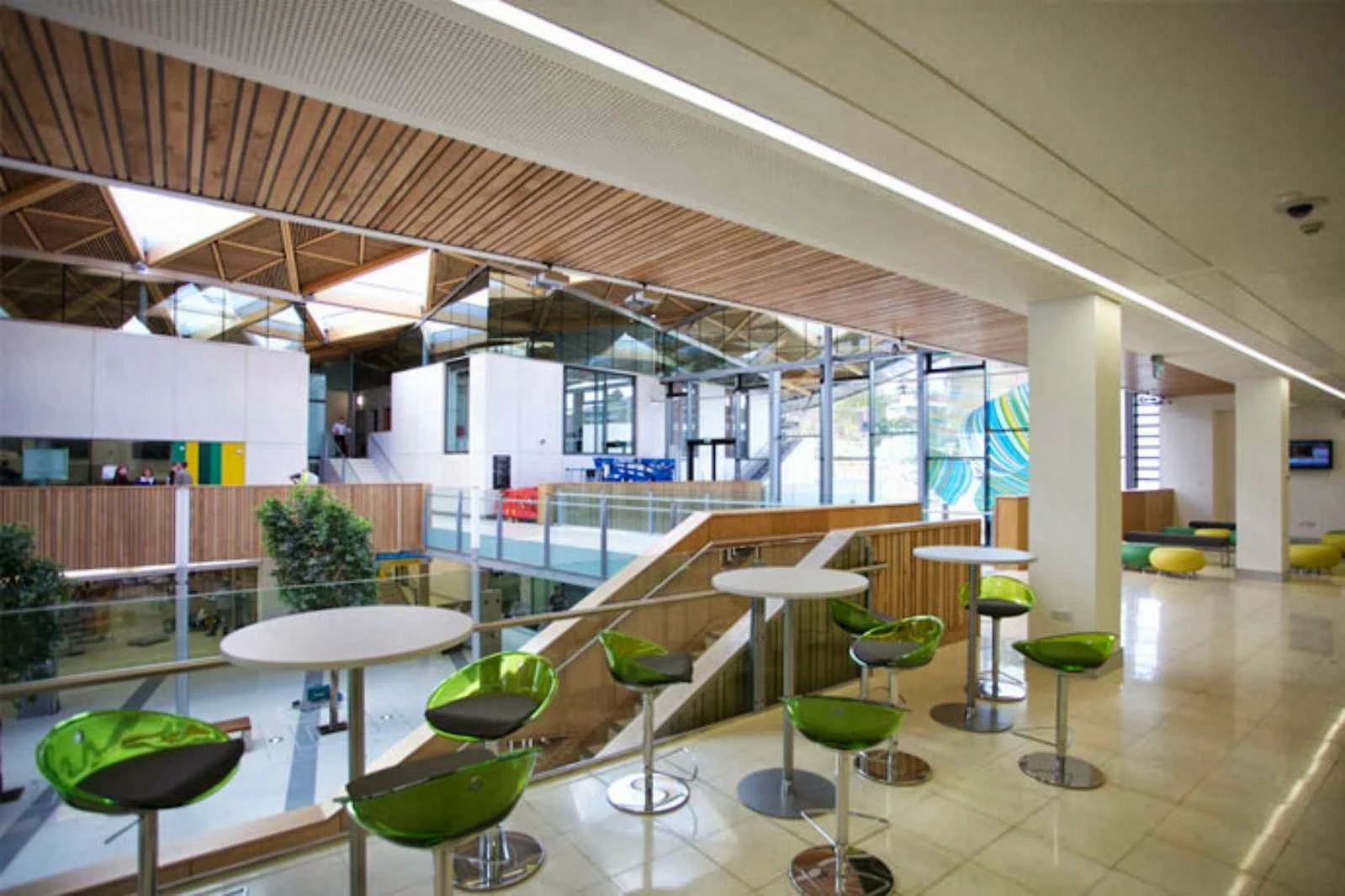 Water the building was designed using Suds principles, with water harvesting, grey water reticulation and new ponds and wetlands created to the south of the campus to assist in water attenuation. Rainwater harvesting provides 75% of the water required for Wc flushing, irrigation and water features within the Forum, with 1,954m² of the roof area used for this harvesting. Low water-use fixtures were selected throughout the new project.