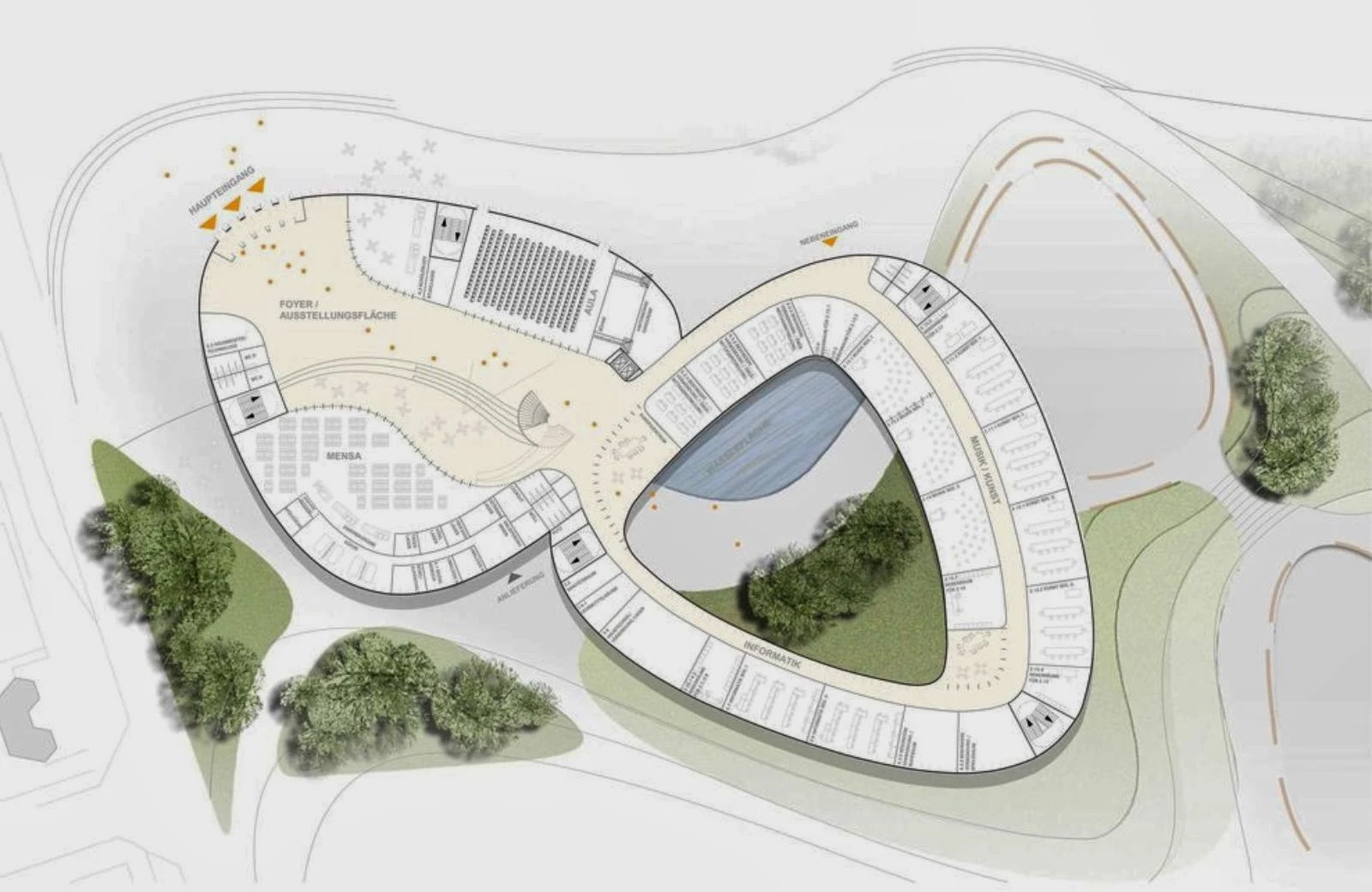 In the quieter eastern ring, the rooms are grouped around a green internal courtyard. the music and art rooms are located at ground level with a direct connection outside; the classrooms are arranged on the upper floors.
