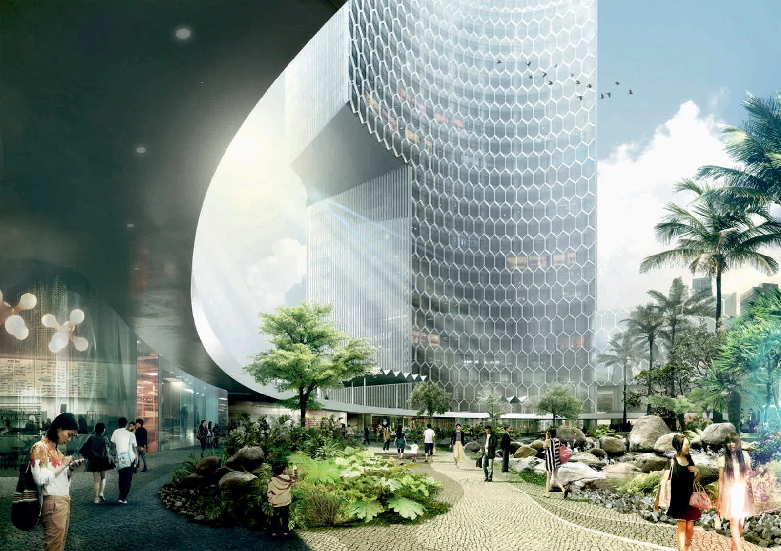 The buildings dematerialize as they reach the ground to provide a porous permeable landscape traversing the site. Leisure zones and gardens act as a connector between multiple transport hubs and establish a flow of tropical greenery and lively commercial activity, accessible to the public 24 hours a day.