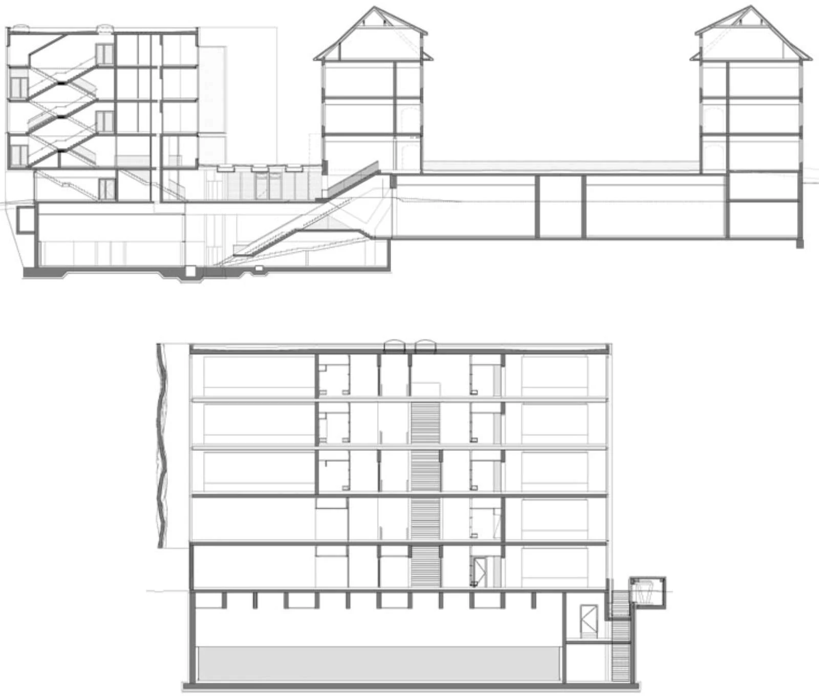 The crinkled wall contrasts strongly with a smooth, flush, street-side façade. A subdued colour palette of whites and greys connects the extension with the original high school buildings constructed in 1907 and with neighbouring twentieth-century villas and fortress.